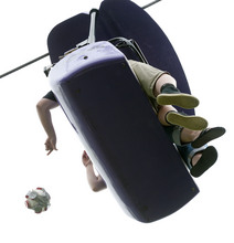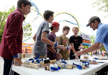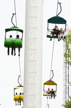 While riding the Sky Ride at Lagoon junior high school students drop protective egg containers at a target as they participate in the Egg Drop event at the Utah State University Physics Day at Lagoon Farmington, Utah Friday, May 16, 2014. Students made protective containers to protect an egg from breaking after being dropped from the Sky Ride.