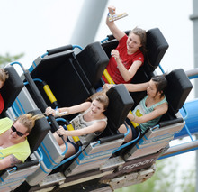 Churchill Junior High School students Alice Vietti, front, Paige Bolingbroke, top and Diane Van, right, wear accelerometers on their wrists as they measure the force they experience on the Colossus Fire Dragon roller coaster during Utah State University Physics Day at Lagoon Farmington, Utah Friday, May 16, 2014.