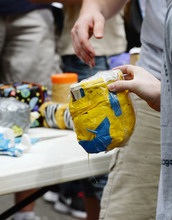 While riding the Sky Ride at Lagoon junior high school students hold their protective egg containers as they participate in the Egg Drop event at the Utah State University Physics Day at Lagoon Farmington, Utah Friday, May 16, 2014. Students made protective containers to protect an egg from breaking after being dropped from the Sky Ride.