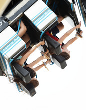 Churchill Junior High School students Alice Vietti, Paige Bolingbroke, and Diane Van, right, wear accelerometers on their wrists as they measure the force they experience as they go upside down on the Colossus Fire Dragon roller coaster during Utah State University Physics Day at Lagoon Farmington, Utah Friday, May 16, 2014.