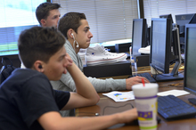 On a recent school day, he worked with several students designing electronic posters. Why use cardboard, they wondered, when they could use the televisions throughout the school?