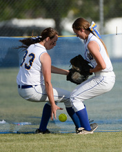 Taylorsville's Tasia Taylor, left, looks to get the ball after a missed catch by Kaylee Wengren as they compete against Lehi for the 5A softball championship at the Valley Softball Complex in Taylorsville on Thursday, May 22, 2014.