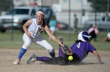 Lehi's Taylor Tahbo gets lucky with a lose ball by Karlee Jensen at second base during the battle for the 5A softball championship at the Valley Softball Complex in Taylorsville on Thursday, May 22, 2014.