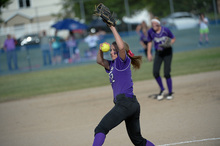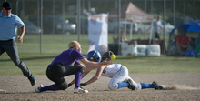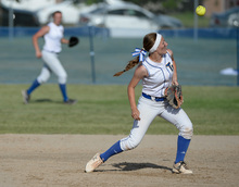 Taylorsville's Karlee Jensen tries to regain control of a ball against Lehi for the 5A softball championship at the Valley Softball Complex in Taylorsville on Thursday, May 22, 2014.