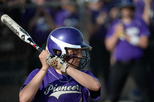 Lehi's Sydney White decides on her next pitch as she battles Taylorsville for the 5A