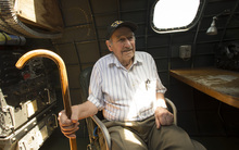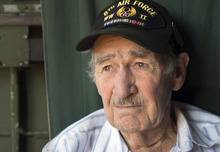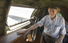 World War Two veteran Sam Wyrouck takes a flight in the "Memphis Belle," a restored WWII B-17 "flying fortress" bomber, for the first time since the war on May 26, 2014. Wyrouck flew in the B-17 as a lower ball turret gunner in World War II.