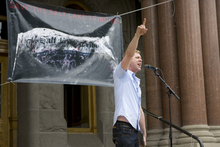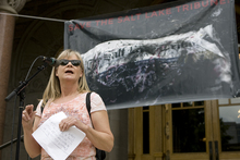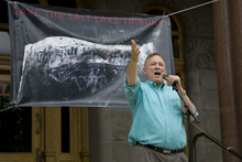 Speaking from the west steps of the historic City-County Building, Dabakis and others insisted the U.S. Justice Department invalidate the deal between the News and Digitial First Media which manages The Tribune and many other papers owned by Alden Global Capital as a blatant anti-trust violation that undermines the viability of the 144-year-old Tribune.