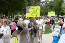 Reader Pamela Thomas held up a sign to traffic on State Street, reading, "A voice for the rest of us."