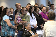 Friends, family, and members of the Ute Tribe gathered at the University of Utah Friday May 30 to announce a new law school scholarship for members of the Ute tribe in honor of David Arapene Cuch, who died in his third year of law school in 2007. Members of the tribe laugh at a story told about Cuch by friend Maxine Natchees. The scholarship will be funded by his friends and family, which include former Utah Director of Indian Affairs Forrest Cuch.