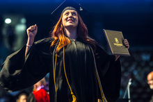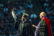 Brett Johnson celebrates after receiving his diploma during Westminster College's Commencement at the Maverik Center Saturday May 31, 2014. 977 students graduated.