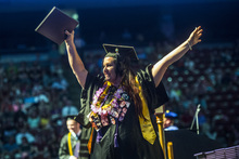 Aimée D'Ann Green celebrates after receiving her diploma during Westminster College's Commencement at the Maverik Center Saturday May 31, 2014. 977 students graduated. Green graduated Cum Laude with a bachelor of science in accounting.