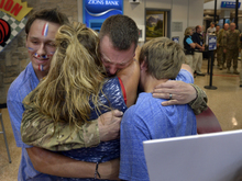Sgt. Maj. Thayne Turgeon is surrounded by his family including his son Kaden, at left, as he is welcomed back along with other Utah National Guard soldiers as they returned home Saturday from a 12-month deployment to Afghanistan. Members of the Guard's 65th Field Artillery Brigade were greeted by their loved ones at Salt Lake City International Airport on Saturday.