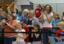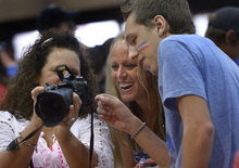 Vickie Whiting, left, Wendy Turegon, and Kaden Turgeon react as they look at a family photo as they waited for Sgt. Major Thayne Turgeon to return from a 12-month deployment to Afghanistan. Members of the Guard's 65th Field Artillery Brigade were greeted by their loved ones at Salt Lake City International Airport, Saturday, May 31, 2014.