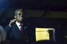Adventist Pastor Ambrose Waahu invites people to stand up and be saved at a crusade in Jamestown near Accra, Ghana. 03/04/2014