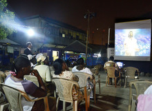 Towns people watch video about Jesus Christ at Adventist crusade in Jamestown, Ghana. 03/04/2014