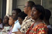 Adventist Mary Antwi greets fellow members during the after meeting lineup in Cape Coast, Ghana. 03/09/2014