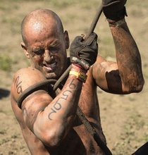 Loud chants and grunts sounded from the starting line every 15 minutes as a new heat of about 300 runners began. Each athlete faced 29 obstacles on a 12-mile trail. Obstacles included a tractor pull, fire jump, sandbag carry, tire drag, spear throw and a rope climb.