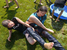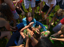 Emilie Lybbert (center) of American Fork simply sat down in the middle of the jello pool to smear her best friend Helen Kepo'o with jello. Hundreds of Utahns threw food at each other Saturday. The inaugural Jiggle Fest at Thanksgiving Point Gardens, featured hourly jello fights and squeals of laughter July 19, 2014.