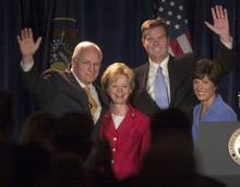 United States Vice President Dick Cheney, his wife Lynne Cheney, John Swallow and his wife Suzanne wave to the audience prior to the Vice President's speech at the Little America in Salt Lake City July 28, 2004.
