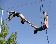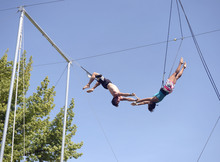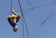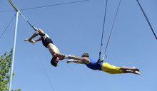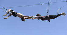 He swings effortlessly, lets go of the bar and flips three times. His fingertips brush the catcher swinging upside down on the other side of the trapeze but they don't connect. The crowd gathered on the ground gasps, then cheers, as Ford hits the net below.