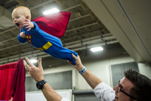Super Man Deacon Ely, 10 months, flies through the air with the help of his dad Tyler at Salt Lake Comic Con FanXperience at the Salt Palace Convention Center on Saturday.
