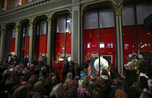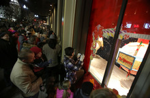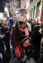 Sophie Allred, 5, and her cousin Allie Lindquist, 17, of Sandy, paiently await Macy's unveiling of the holiday candy windows at Macy's City Creek on Thursday, Nov. 21, 2013. The windows which kick off the holiday season, are made entirely out of candy and reflect Salt Lake City and the luster of the holiday season. Six local artists were chosen to design the windows.