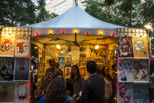 Festival attendees look at art and illustrations by Chris Bodily at Craft Lake City at the Gallivan Center Friday August 8, 2014.