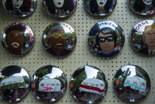 Painted semi truck hub caps by artist Tommy Dolph at Craft Lake City at the Gallivan Center Friday August 8, 2014.