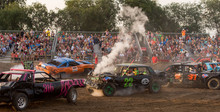 A car begins to smoke in the Dog Days Demolition derby at the Salt Lake County Fiar, Saturd