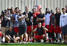 Utah head coach Kyle Whittingham follows through on a golf shot as players react to it heading towards a group of spectators. The team held some sort of golf competition after Utah football practice with pads on the baseball field, Thursday, August 7, 2014.