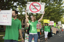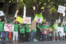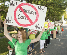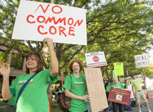 Protesters wore green shirts bearing the message "No More Common Core," and they chanted the same in front of the office.