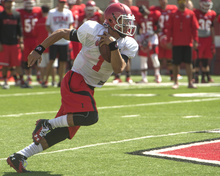 Ute QB, Kendal Thompson runs with the ball, during practice at Rice Eccles Stadium, Wednesda