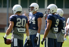 BYU's tight end, Devin Mahina, No. 84, works out with the rest of the team during the first practice of the season.