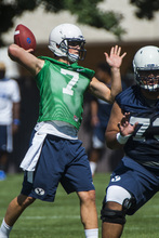 Brigham Young Cougars quarterback Christian Stewart (7) during a practice at Richards Building Fields Friday August 1, 2014.