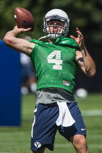 Brigham Young Cougars quarterback Taysom Hill (4) during a practice at Richards Building Fields Friday August 1, 2014.