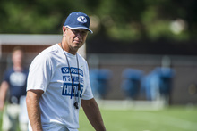 Brigham Young Cougars head coach Bronco Mendenhall during a practice at Richards Building Fields Friday August 1, 2014.