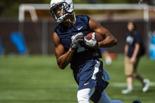 Brigham Young Cougars wide receiver Ross Apo (1) makes a catch during a practice at Richar
