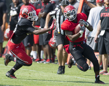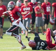 Marcus Williams (20) tries to bring down, Dominique Hatfield (15) during the University of Utah football practice, Saturday, August 9, 2014