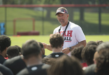 Head coach Kyle Whittingham, talks to his team, at the University of Utah football practice, Saturday, August 9, 2014