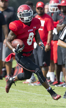 Tavaris Williams (8) runs with the ball, during the University of Utah football practice, Saturday, August 9, 2014