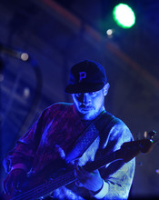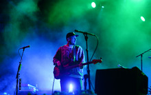 Colored lights illuminate the stage as Zach Carothers, of Portugal. The Man, sings as th