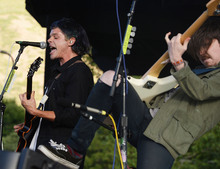 Colored lights illuminate the stage as John Gourley and Zach Carothers, of Portugal. The Man, sing as the band co-headlined with Grouplove during a sold-out show at the Red Butte Garden Amphitheatre in Salt Lake City, Tuesday, August 19, 2014.