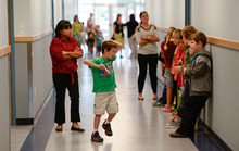 But in many of those rooms, the lights stayed off to help keep students calmer. Youngsters fiddled with foam blocks or balls of clay to help them focus. Some flapped their hands, and others carried headphones to muffle sharp noises.