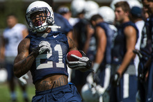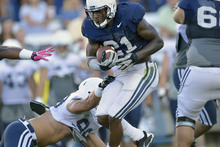 A BYU football spokesperson confirmed today that junior running back Jamaal Williams suffered a mild knee sprain during Wednesday's scrimmage at LaVell Edwards Stadium, but described the injury as "not serious." Media members were not allowed to watch the scrimmage, which coach Bronco Mendenhall said on Tuesday was mostly held to give coaches a good look at younger players. There is no timetable for Williams' return to practice, and he will be evaluated on a daily basis. The Cougars begin preparations for their opener on Aug. 29 at UConn in earnest on Friday. However, Williams is not expected to play in that game. The junior from Fontana, Calif., said three weeks ago that he will miss the opener due to suspension. Williams said he violated BYU's honor code. "We were caught off-guard a little bit by that," BYU athletic director Tom Holmoe said Wednesday when asked if likes to see athletes announce their own suspensions. "This day and age, with social media and such, we don't have rules against it. It just kinda surprised us," Holmoe said. "But these are big boys and girls, and they took it upon themselves to do that, and I am OK with it. I wish they would have communicated and collaborated with our staff. We have professionals that can help it go more smoothly. But they chose to do that, and took accountability for themselves. I am OK with that." Receiver Devon Blackmon also announced his own suspension via Twitter. "Yes, it is always smart communication-wise to talk about things [first]," Holmoe said. "We do it as a staff all the time, but when we don't, something goes wrong. So, we are just trying to practice [that] and help them understand and practice good judgement." When he spoke to media members in February, Holmoe announced that BYU will no longer acknowledge or discuss honor code violations unless the athletes themselves announce them or somehow go public with them. When coaches announce suspensions, they will generally just say the athlete violated team rules and leave it at that."i am [happy] with how that is working. We worked to put that in place to protect our student's privacy. I think it is ironic that we have had a couple kids come through on their own and announce their own suspensions, and now everybody wants us to say [reasons], and that is not going to happen," Holmoe said.