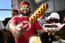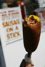 The chicken waffle, which will sell for about $6, combines two of America's favorite fair trends: deep-frying and food-on-a-stick. Fairgoers from Minnesota to Los Angeles have dined on pizza, ravioli, pork chops and even peanut butter and jelly sandwiches on a stick. This year, a young entrepreneur at the Idaho state fair in Boise created the "corn hog," a quarter-pound piece of bacon, battered and deep-fried and served on a stick.