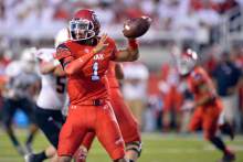 Utah Utes quarterback Kendal Thompson (1) throws the ball during the second half of the game at Rice-Eccles stadium Thursday August 28, 2014. Utah defeated Idaho State 56-14.