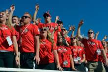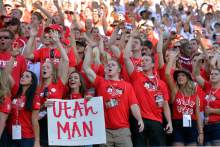 Members of the MUSS cheer during the first half of the game against Idaho State Bengals at Rice-Eccles stadium Thursday August 28, 2014. Utah is winning the game 35-7.