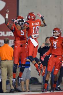 Utah Utes quarterback Brandon Cox (5) celebrates his touchdown with Utah Utes wide receiver Delshawn McClellon (10) and Utah Utes wide receiver Tim Patrick (9) during the second half of the game at Rice-Eccles stadium Thursday August 28, 2014. Utah defeated Idaho State 56-14.
