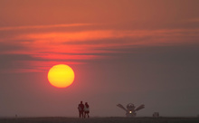 A couple watches the sunrise at the Burning Man festival in the Black Rock Desert, north of Reno, Saturday morning, August 30, 2014.