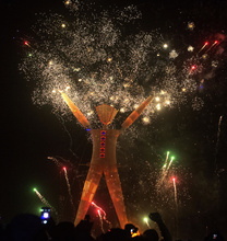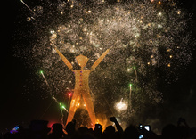 The Burning Man is surrounded by fireworks Saturday night at the Burning Man festival in the
